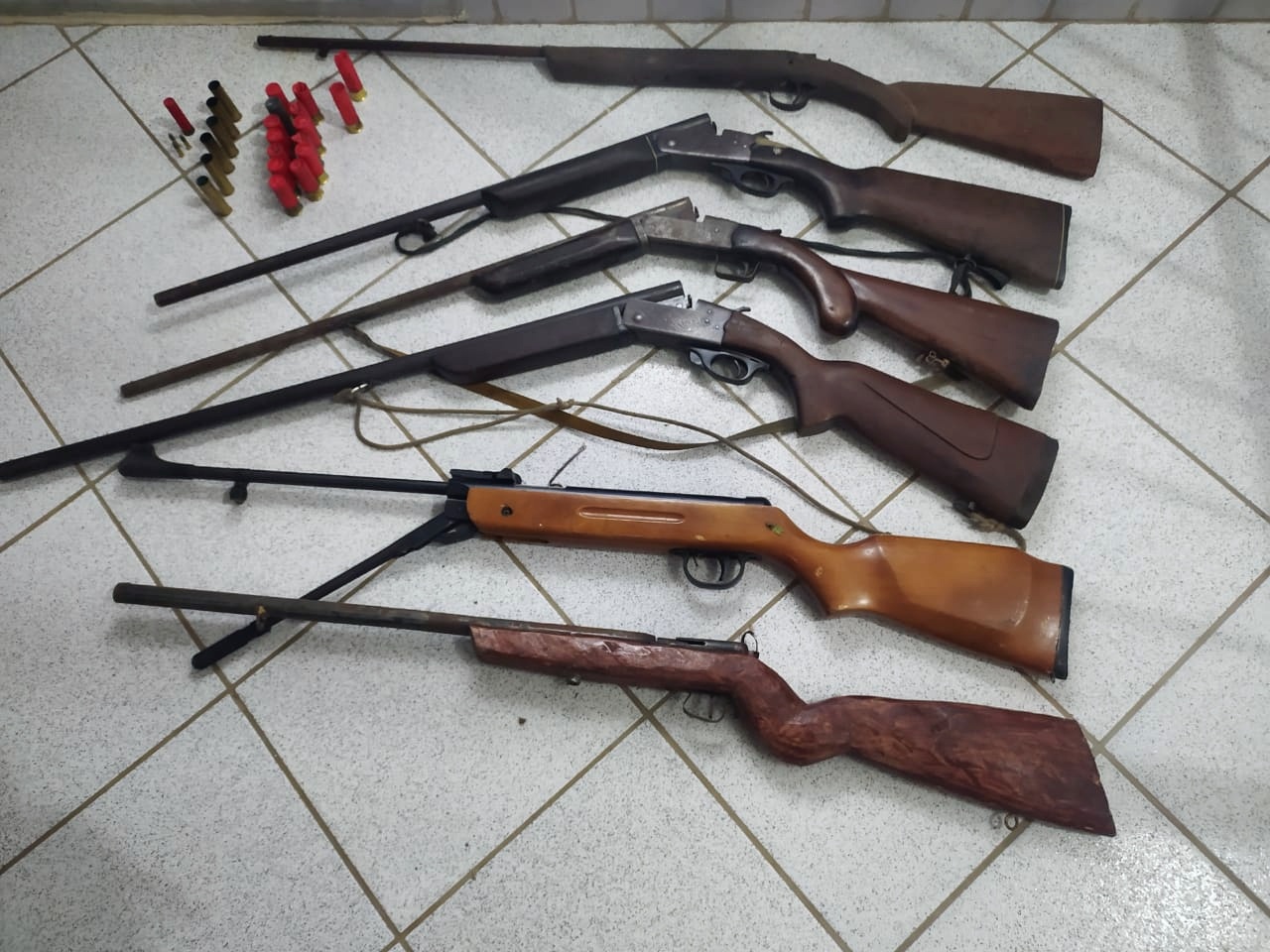 Diante dos fatos, foram realizadas buscas pela residência e localizadas 6 armas de fogo de diversos calibres, sendo uma espingarda Marca CBC cal. 22; uma espingarda Marca CBC cal. 32; uma espingarda Marca CBC cal. 28; duas espingardas Marca CBC cal. 12; uma espingarda Marca CBC cal. 40.