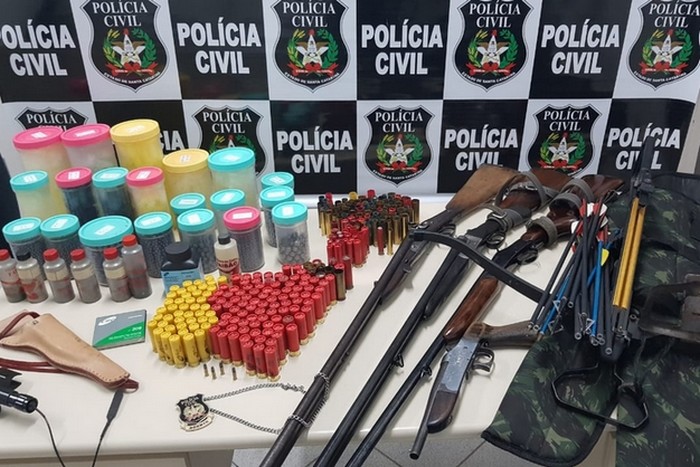A Policia Civil apreendeu também uma arma chamada balestra, cuja estrutura é semelhante à de um arco e flecha. “O suspeito foi preso e encaminhado ao Presídio Regional de Mafra, onde ficará a disposição da justiça e responderá pelos crimes de relativos à violência doméstica e familiar contra a mulher (lei Maria da Penha), bem como por posse ilegal de arma de fogo, munições e acessórios”, frisou o delegado.
