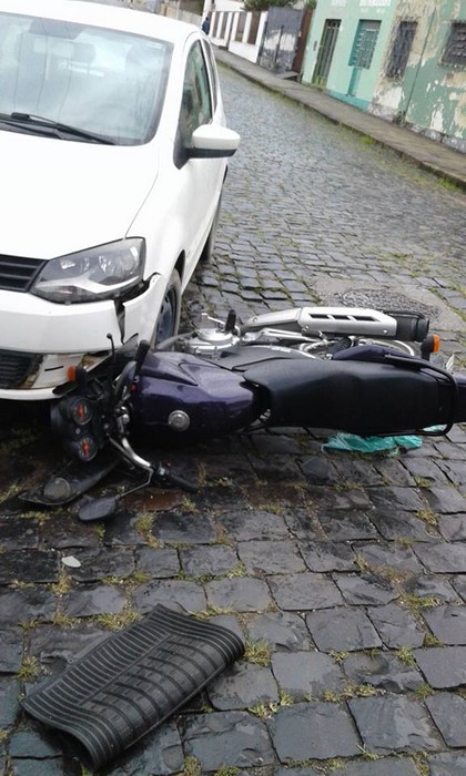 A mulher de 64 anos que conduzia o veÃculo VW/Fox, veio a invadir a preferencial e acabou colidindo com a motocicleta, que ficou prensada embaixo da roda.