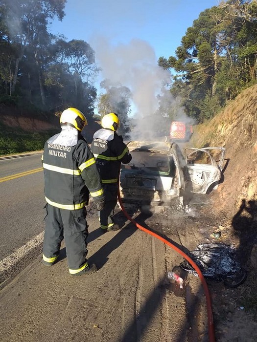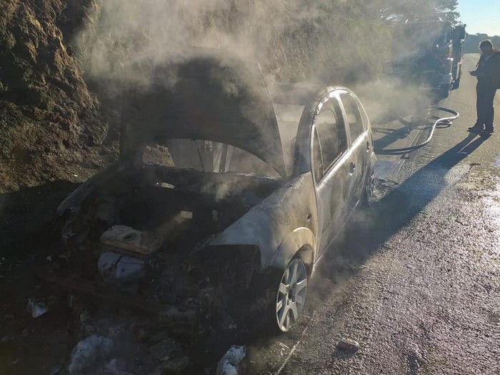 No local constataram se tratar de um veÃculo Citroem C3, placas da Fazenda Rio Grande/PR, totalmente consumido pelas chamas. O motorista de 45 anos saiu do veÃculo e não sofreu nenhuma lesão.