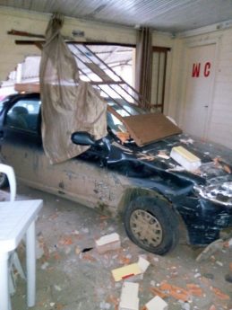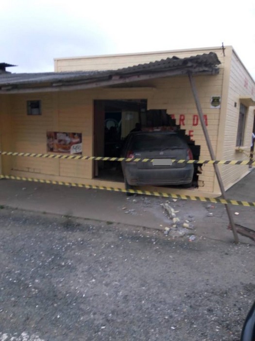 O veÃculo Fiat/Pálio após se envolver no acidente com o GM/Corsa, onde a motorista acabou perdendo o controle de direção e veio invadir um estabelecimento comercial (bar), vindo a derrubar a parede, mas felizmente não atingiu ninguém.