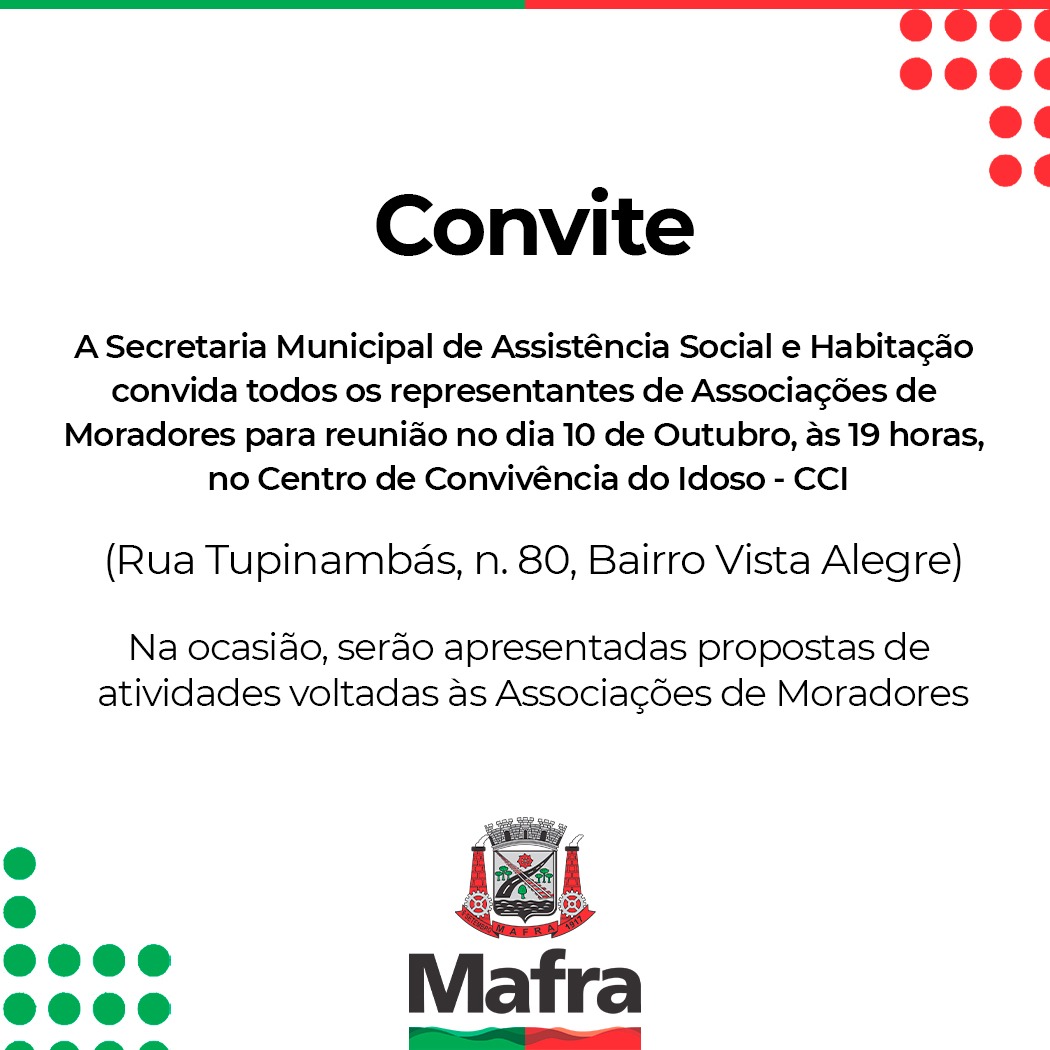 A Secretaria Municipal de Assistência Social e Habitação realizará no dia 10 de outubro, próxima segunda-feira, à s 19 horas, no CCI – Centro de Convivência do Idoso, reunião com todos os representantes de Associações de Moradores.