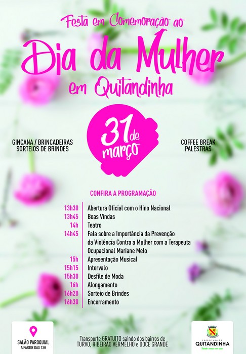 Em homenagem ao Dia da Mulher, comemorado em 8 de março, a prefeita Maria Julia fará um evento especial no próximo dia 31 (domingo). A mulherada de Quitandinha está convidada a participar de uma tarde de lazer, com palestras, brincadeiras e sorteio de brindes. O evento será gratuito.