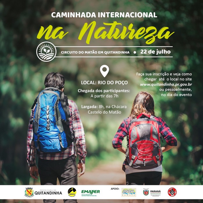 O municÃpio de Quitandinha, na região metropolitana de Curitiba, realizará a primeira Caminhada Internacional na Natureza neste domingo. O percurso será de 12 km no Circuito do Matão no Rio do Poço. O trajeto apresenta lindas paisagens, grande área de vegetação, propriedades rurais de agricultores, bosques, rios e grutas.