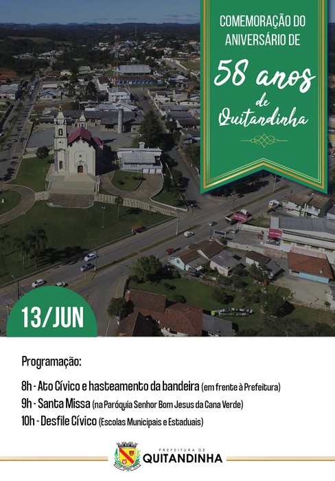 “Estamos fazendo um evento bem bonito. Tenho certeza que todos vão se emocionar. Quitandinha é uma cidade muito boa de morar e precisamos desejar os parabéns assim, com a participação de todos. Prestigiem essa comemoração!”, convida a prefeita Maria Julia.