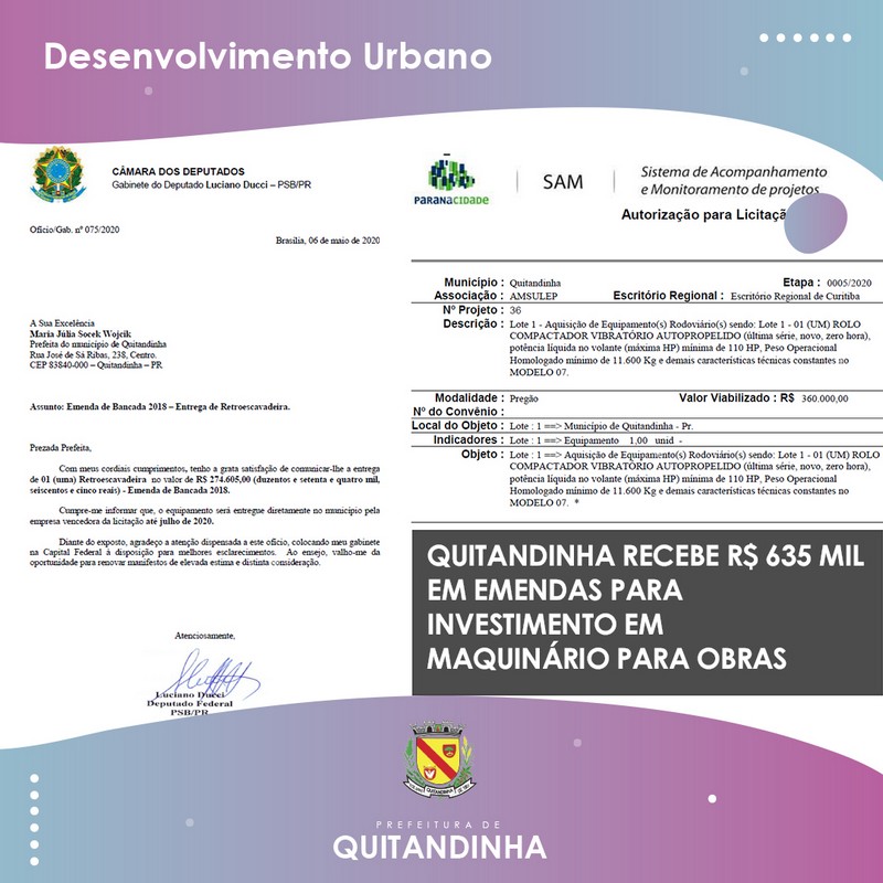 Quitandinha contará com novos maquinários para o setor de Obras do município. Um Rolo Compactador de R$ 360 mil e uma Retroescavadeira de R$ 275 mil compor a frota de veículos de manutenção da cidade, vindos de recursos de emenda parlamentar do Deputado Federal Luciano Ducci e do Deputado Estadual Francisco Buhrer. A Retroescavadeira já está licitada e será a primeira a chegar ao próximo mês, o Rolo Compactador ainda irá para a licitação e deverá chegar ao segundo semestre.