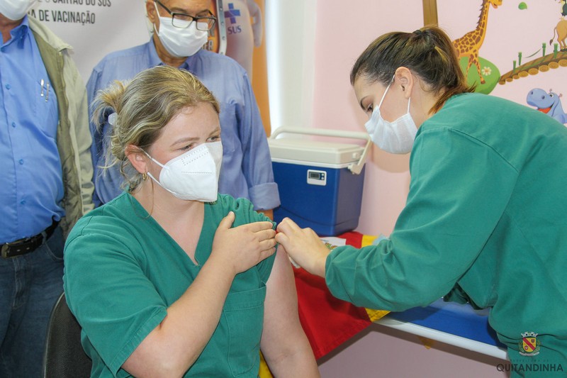 Indianara Regiane de Medeiros, 31 anos, que é Coordenadora da Atenção Básica e Enfermeira da Unidade Covid de Quitandinha, foi a primeira pessoa do municÃpio a receber a vacina. Indianara fez, até o momento, aproximadamente 1.000 coletas do teste do Covid-19 nos munÃcipes que buscaram atendimento na Unidade Covid.