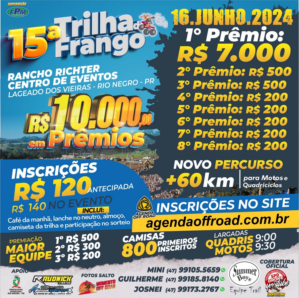 O novo percurso terá mais de 60 km de trilhas para motos e quadriciclos. A largada para os quadris será às 9h; para as motos será às 9h30. As inscrições antecipadas com o valor de R$ 120,00 podem ser realizadas pelo site www.agendaoffroad.com.br. A inscrição dá direito ao café da manhã, almoço, lanche no neutro e camisas para os 800 primeiros inscritos.