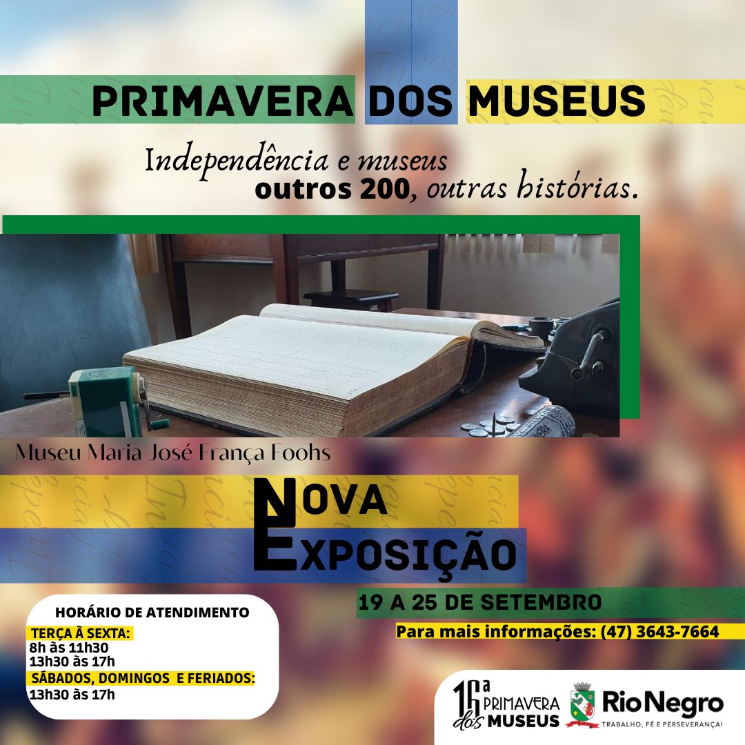 Na próxima segunda-feira, 19 de setembro, o Museu Histórico Professora Maria José França Foohs dá início a 16ª Primavera de Museus em Rio Negro. O tema para 2022 é “Independência e museus, outros 200, outras histórias”. A Primavera é uma temporada cultural coordenada pelo Ibram que acontece todo ano no início da estação homônima. A cada ano, o Ibram lança um tema diferente para nortear as atividades dos museus.