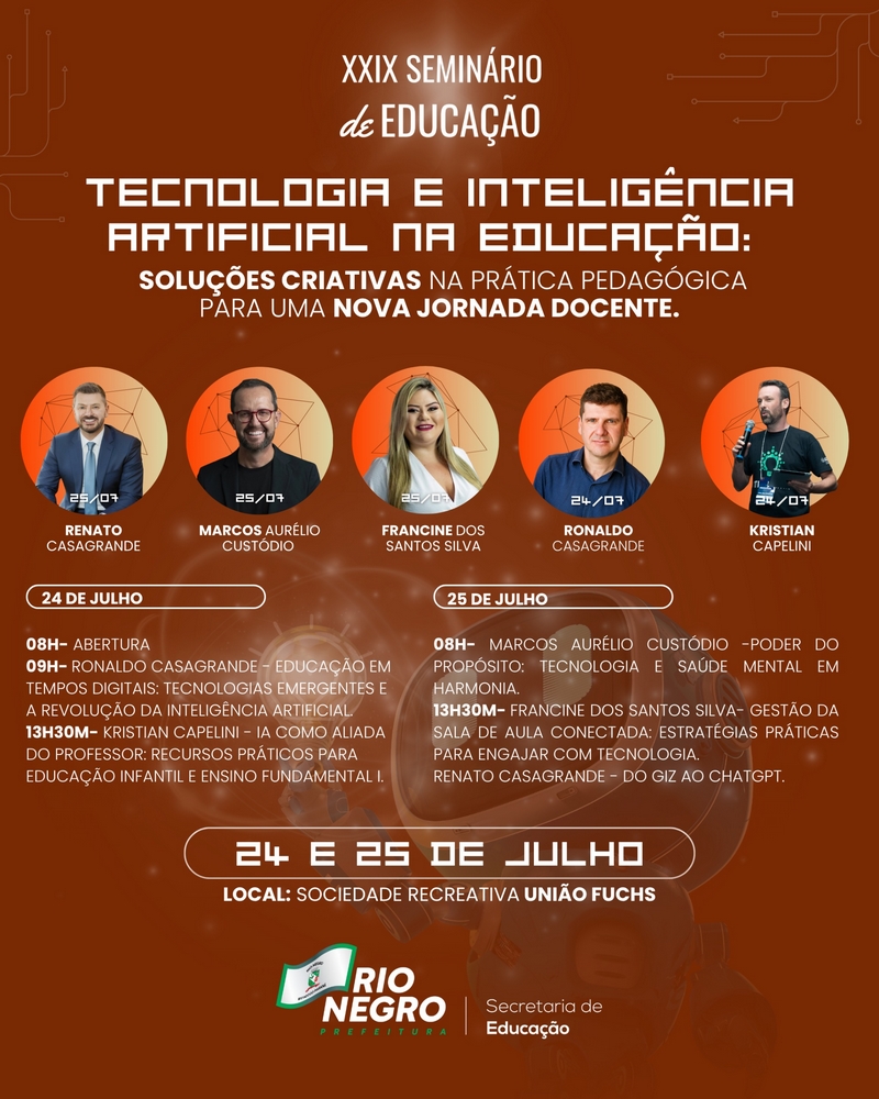 O maior evento de educação da região será realizado na próxima semana em Rio Negro. Nos dias 24 e 25 de julho ocorrerá o 29º Seminário de Educação no salão da Sociedade Recreativa União Fuchs, no bairro Bom Jesus.