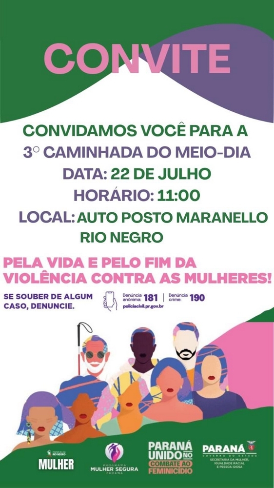 A Prefeitura de Rio Negro, através do Departamento da Mulher, convida a população para participar deste importante evento que integra a campanha Paraná Unido no Combate ao FeminicÃdio da Secretaria da Mulher, Igualdade Racial e Pessoa Idosa e ocorrerá simultaneamente em diversos municÃpios do Estado.