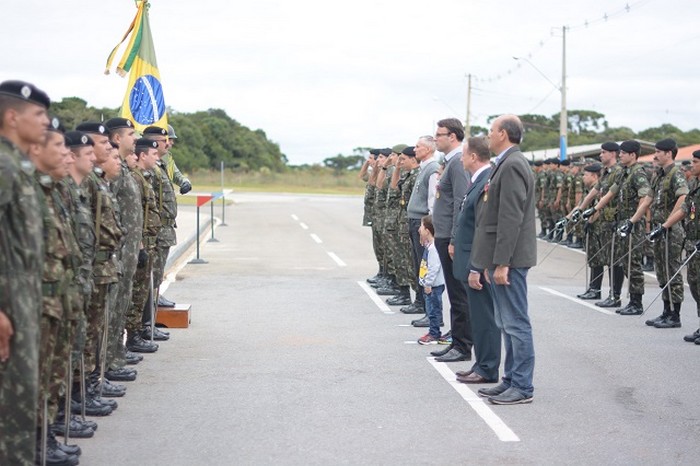 Em seguida foi feita a entrega da medalha “Sangue Rionegrense” e medalha “Tenente Ary Rauen” a militares e autoridades civis da região, bem como o diploma de “Amigo do Regimento” a personalidades civis que prestaram serviços relevantes ao 5º RCC.