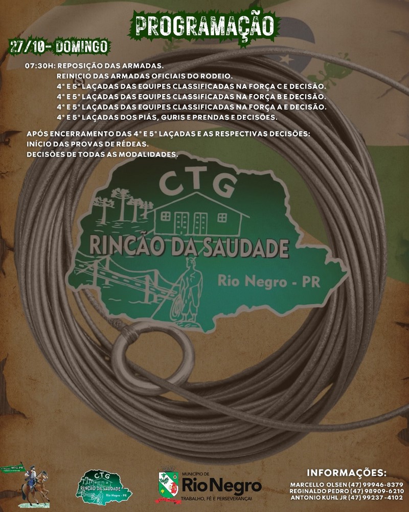 O 6º Rodeio Crioulo do CTG Rincão da Saudade será realizado entre os dias 25 e 27 de outubro na Cancha Municipal “Dr. Nailor Aymoré Olsen”, localizada no bairro Volta Grande, junto ao Parque de Eventos Dr. Valmor Nardes. Serão diversas atrações. Confira a programação completa: