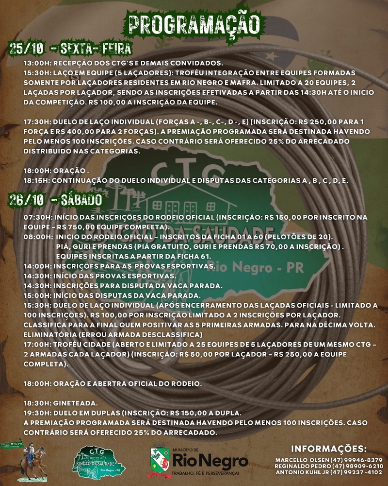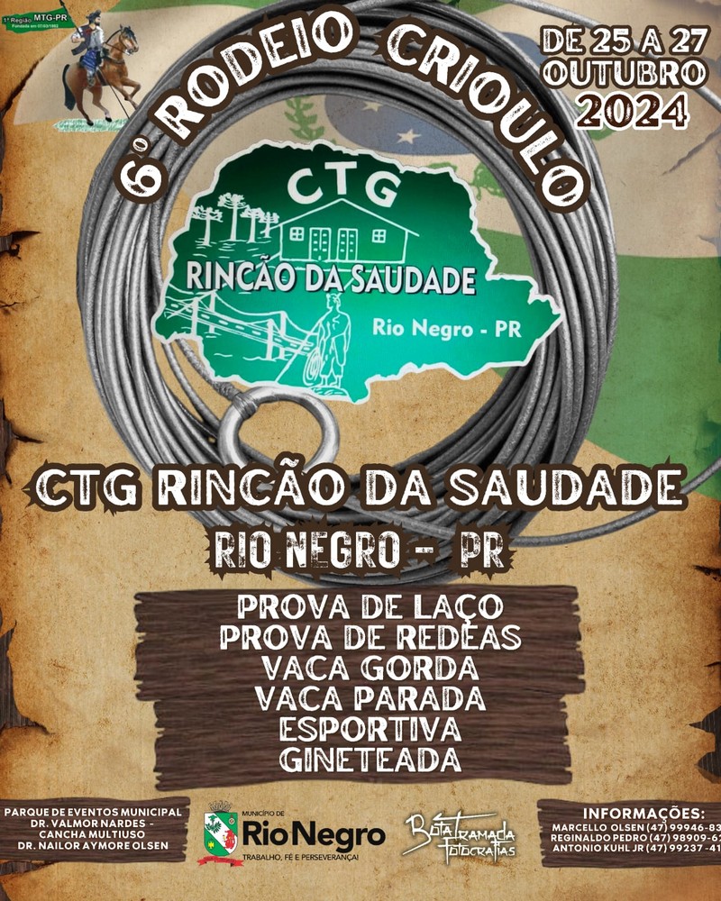 O 6º Rodeio Crioulo do CTG Rincão da Saudade será realizado entre os dias 25 e 27 de outubro na Cancha Municipal “Dr. Nailor Aymoré Olsen”, localizada no bairro Volta Grande, junto ao Parque de Eventos Dr. Valmor Nardes. Serão diversas atrações. Confira a programação completa: