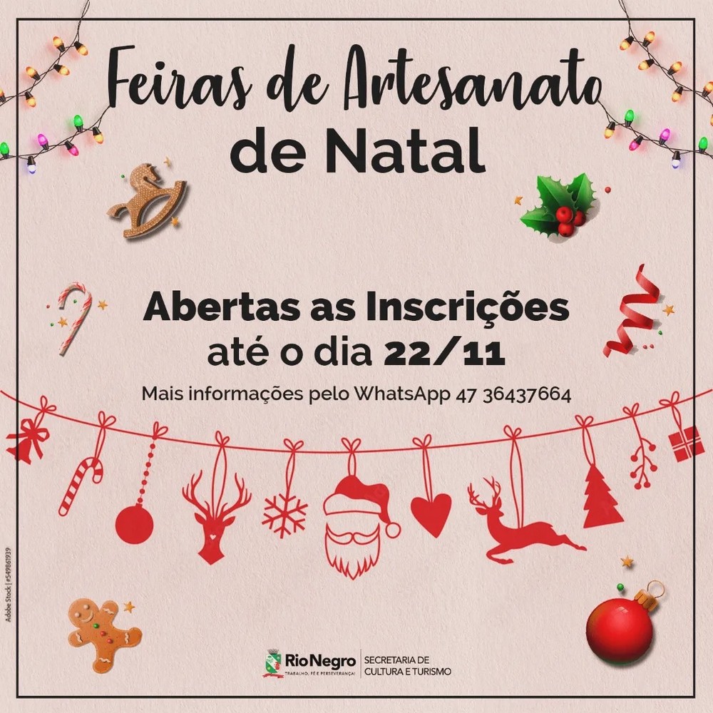 Estão abertas as inscrições para as Feiras de Artesanato de Natal em Rio Negro. As inscrições são gratuitas e podem ser feitas pelo link: https://forms.gle/iEqySEviqd5UMTG16