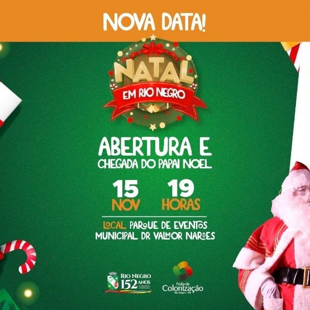O Papai Noel chegará a Rio Negro nesta terça-feira para a alegria das crianças e de toda a família rio-negrense e da região. Devido ao tempo chuvoso no último domingo, a abertura do Natal foi transferida para este feriado de 15 de novembro e aniversário do município.