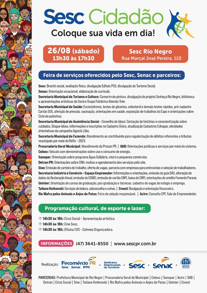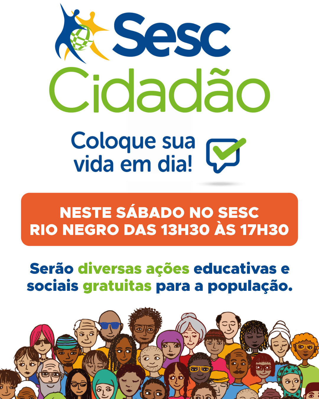 No próximo sábado, dia 26 de agosto, será realizada em Rio Negro a ação Sesc Cidadão, das 13h30 às 17h30. O evento ocorrerá na unidade do Sesc, localizada na Rua Marçal José Pereira, nº 110.