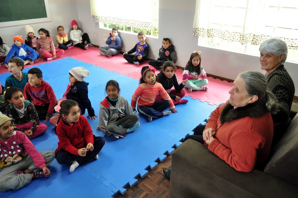 Alunos do primeiro e segundo ano receberam a visita das senhoras Shirley Costa von Linsingen e Sheila Rds, que contaram muitas histórias infantis e deixaram as crianças muito mais aquecidas nesta época de frio.