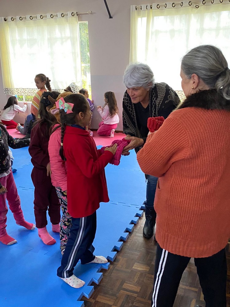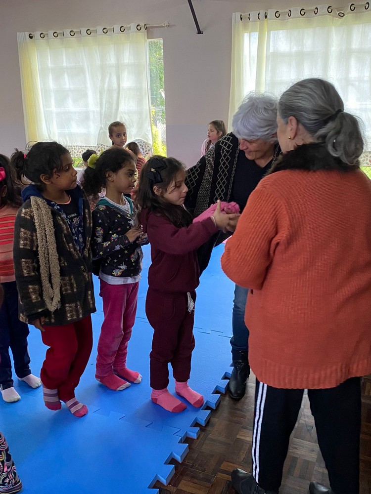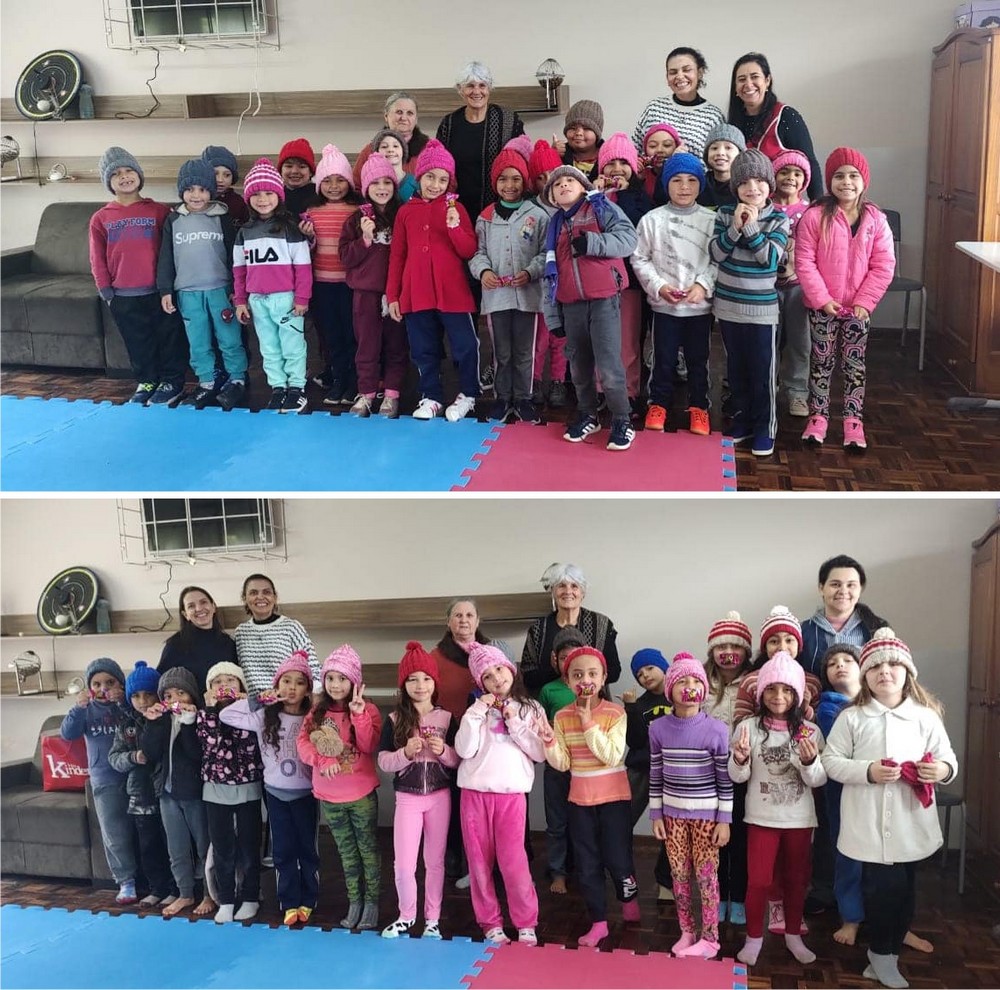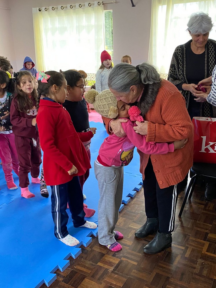 Além da visita e interação, as crianças receberam de presente lindas toucas que foram carinhosamente confeccionadas pela dona Shirley com a técnica do crochê.
