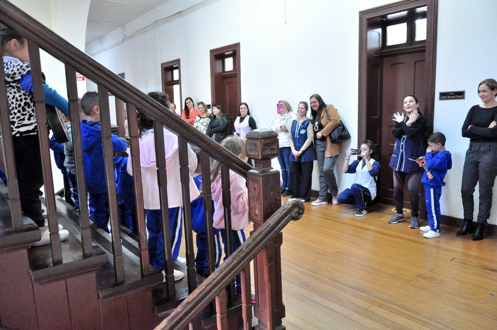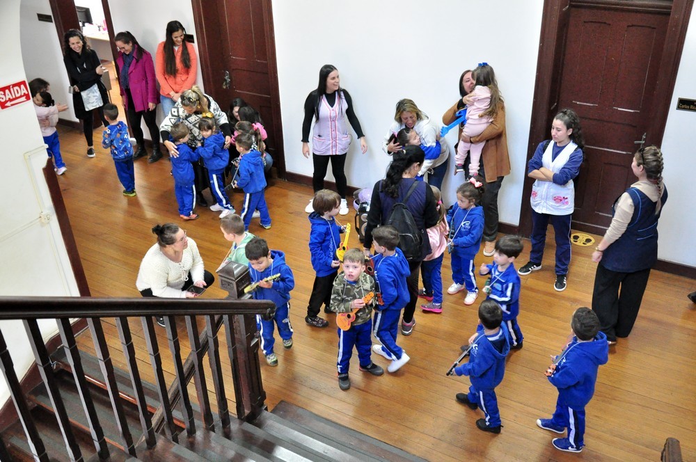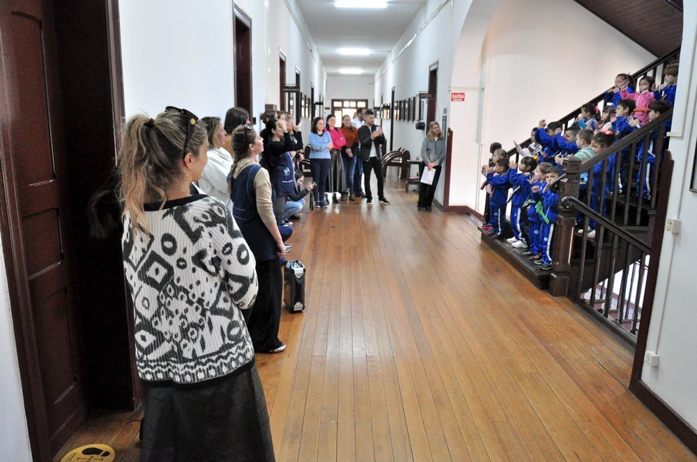 Os alunos cantaram e tocaram “instrumentos musicais” em todos os pisos, homenageando as mães de todas as secretarias que atuam no prédio.