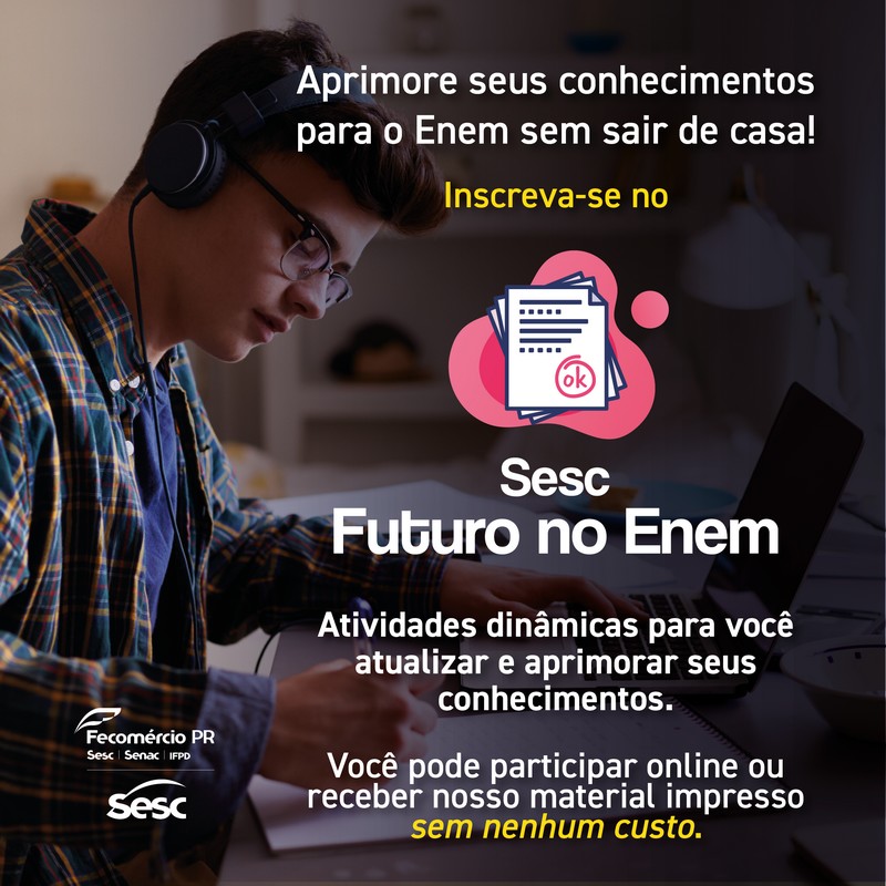 O Sesc Rio Negro oferece a partir do dia 30/06 o projeto Futuro no ENEM. Serão aulas dinâmicas ao vivo, transmitidas todas as terças-feiras e quinta-feiras, das 8h30 às 9h30 ou das 14h às 15h.