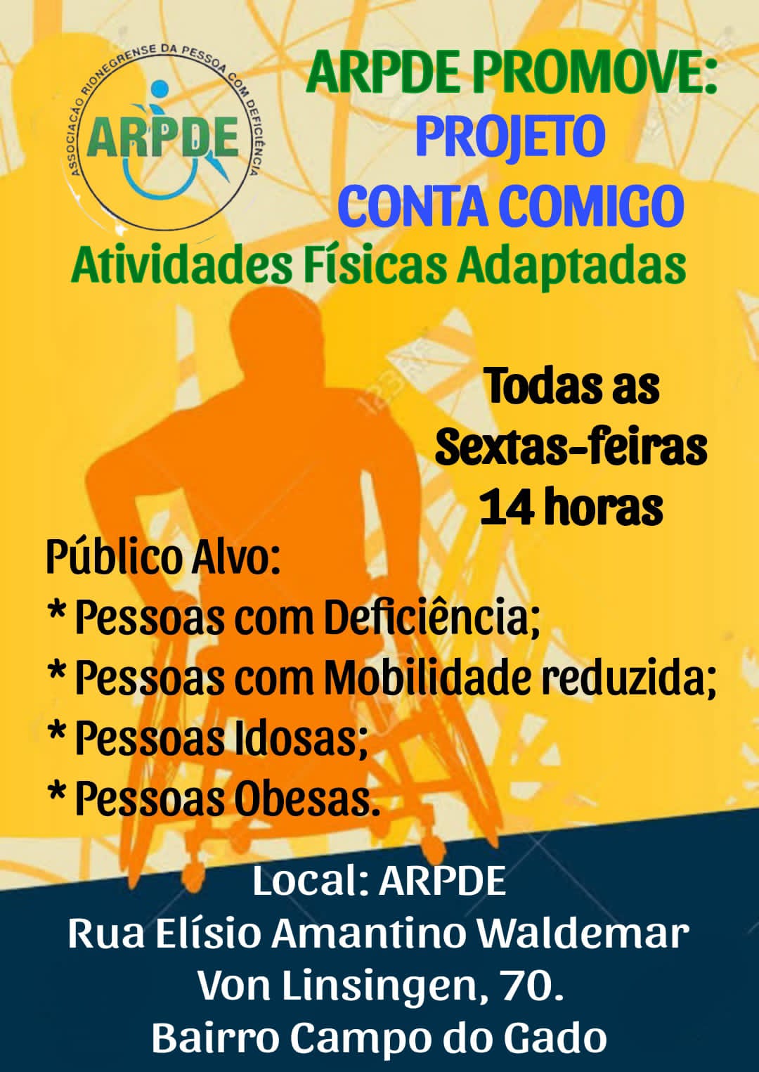 A Associação Rionegrense de Pessoas com Deficiência (ARPDE) mantém em Rio Negro o projeto Conta Comigo, que oferece atividades fÃsicas adaptadas para pessoas que possuem algum tipo de limitação fÃsica. A ação é realizada através de uma importante parceria com a Secretaria Municipal de Esportes e Lazer.