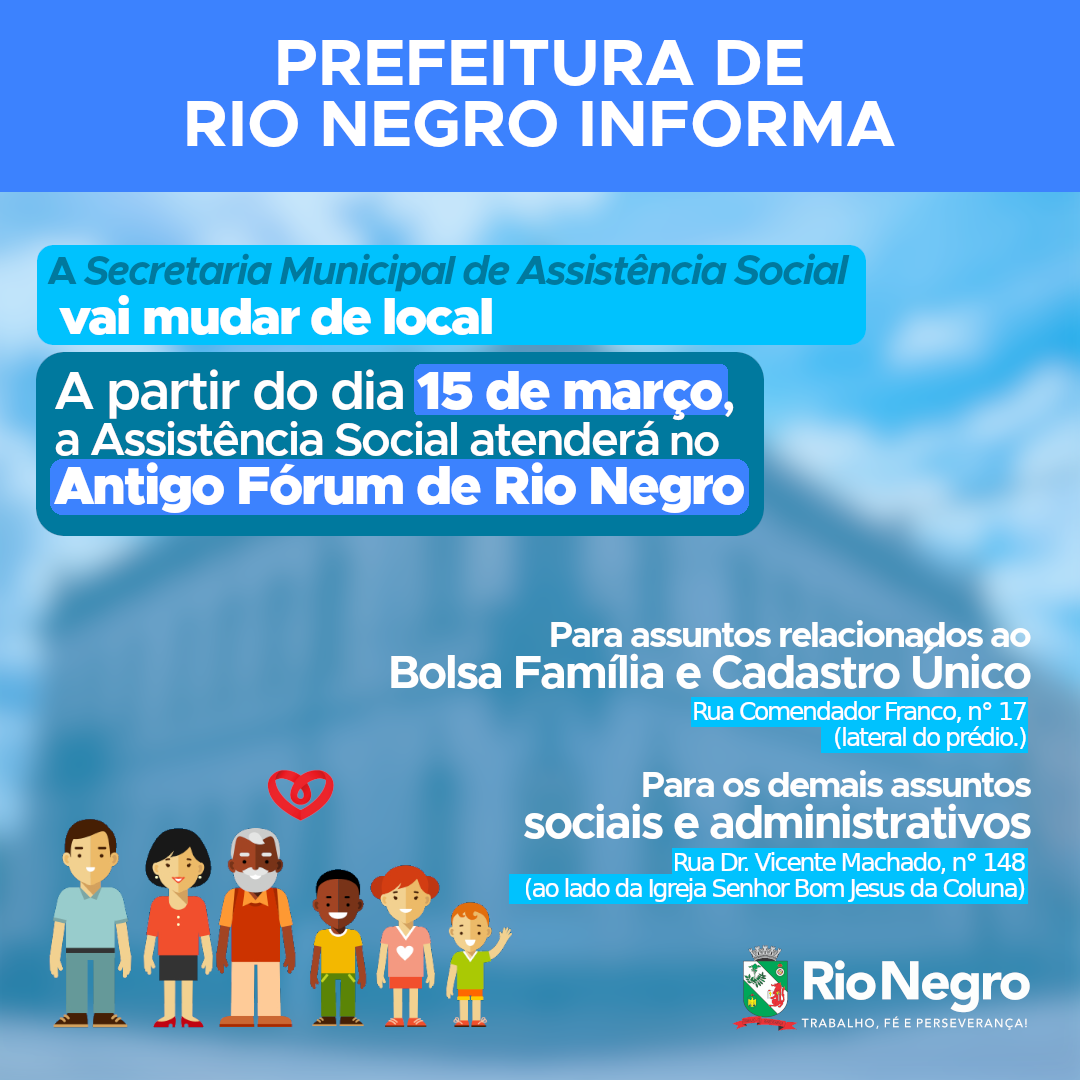 A partir do próximo dia 15 de março, segunda-feira, a Secretaria Municipal de Assistência Social de Rio Negro passará a atender em novo endereço: junto ao prédio histórico ‘Desembargador José Pacheco Junior’, antigo Fórum de Justiça, no centro do municÃpio.