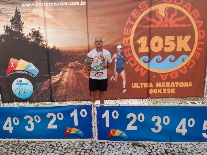 Sérgio conta como foi a competição: “A corrida foi muito difícil, pois a parte dos 80 km em estrada de chão estava bem irregular com muitas pedras soltas, buracos, subidas fortes e barro. Infelizmente não fui com as minhas melhores condições físicas. Não consegui treinar como deveria por causa de dores no quadril e coxa e acabei sentindo fortes dores a partir do km 52 da prova. Participei da prova na categoria “com apoio”, onde podia ser acompanhado por um carro de apoio, onde foram meus amigos Gustavo Les, fisioterapeuta, e Julio Damasceno, maratonista. Gustavo me acompanhou de bike aproximadamente 70 km do percurso, apoiando incondicionalmente com massagens, alimentação e hidratação durante a prova, e o Julio correu ao meu lado 20 km. Na parte mais crítica do dia, onde o sol estava forte e a vontade de abandonar a competição era grande, se não fosse meus amigos eu não teria conseguido completar a prova. Terminei a ultra no tempo de 13h00m56s, chegando em quarto lugar na classificação geral e em segundo lugar na categoria 35 a 39 anos. Meu próximo desafio será em novembro, onde o objetivo será correr 275 km em 48 horas na Ultramaratona Paraná 2019”.