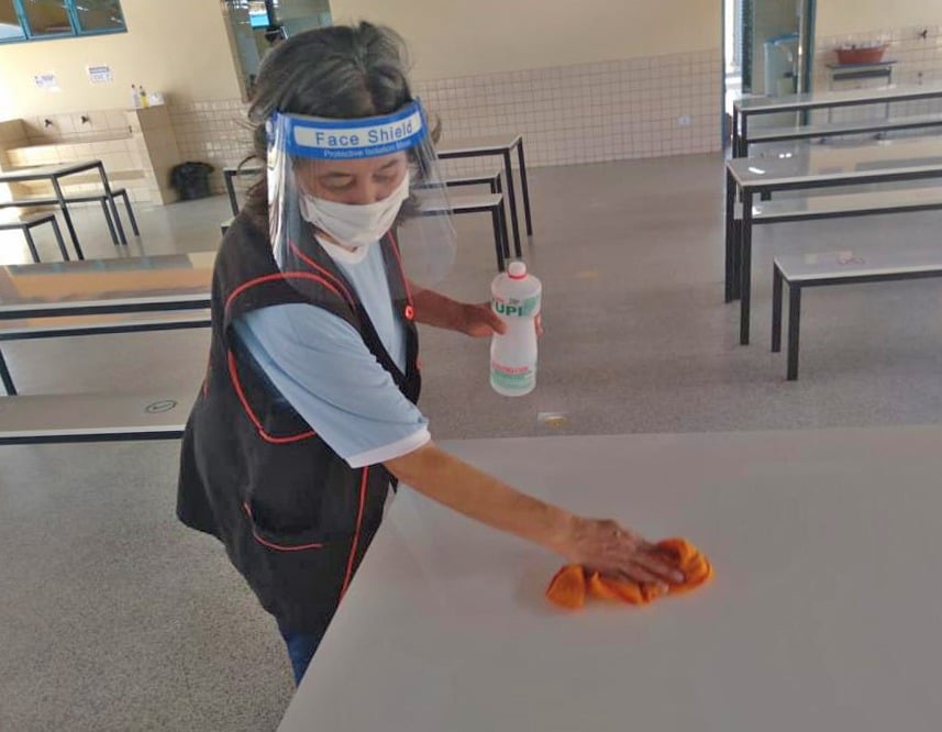 Dentre os protocolos aplicados estão os tapetes sanitizantes colocados na entrada das salas de aulas e das Unidades. Todos os alunos e funcionários tem sua temperatura medida ao chegar na Escola. Todos os espaços contam com marcações no chão indicando o distanciamento de 1,5 metros entre as pessoas. As carteiras estão dispostas de acordo com as normas protocolares de distanciamento. Álcool em gel e sabão para a lavagem das mãos em lugares próprios e específicos. As mãos de alunos, professores e funcionários, bem como carteiras e demais objetos são frequentemente higienizados. Máscaras de tecido e face shield para profissionais e alunos. Sanitizações constantes realizadas com hipoclorito de sódio e outros produtos específicos para combate ao coronavírus. Cartazes e placas informam os alunos sobre práticas e comportamentos que nos ajudam na prevenção de uma possível contaminação.