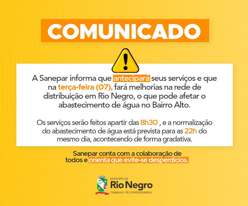 A Sanepar informa que nesta próxima terça-feira (07) fará o serviço de melhorias na rede de distribuição em Rio Negro, o que pode afetar o abastecimento de água no Bairro Alto.