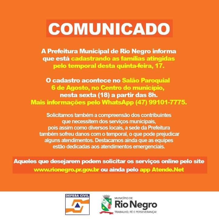 Em Rio Negro, se você precisa de ajuda, o Corpo de Bombeiros estará distribuindo lonas e auxiliando as famílias que necessitarem. Para isso, se dirija ao quartel do Corpo de Bombeiros, ao lado do Colégio Caetano Munhoz da Rocha. Emergência ligue 193 ou 47 8801-2127 (Defesa Civil).