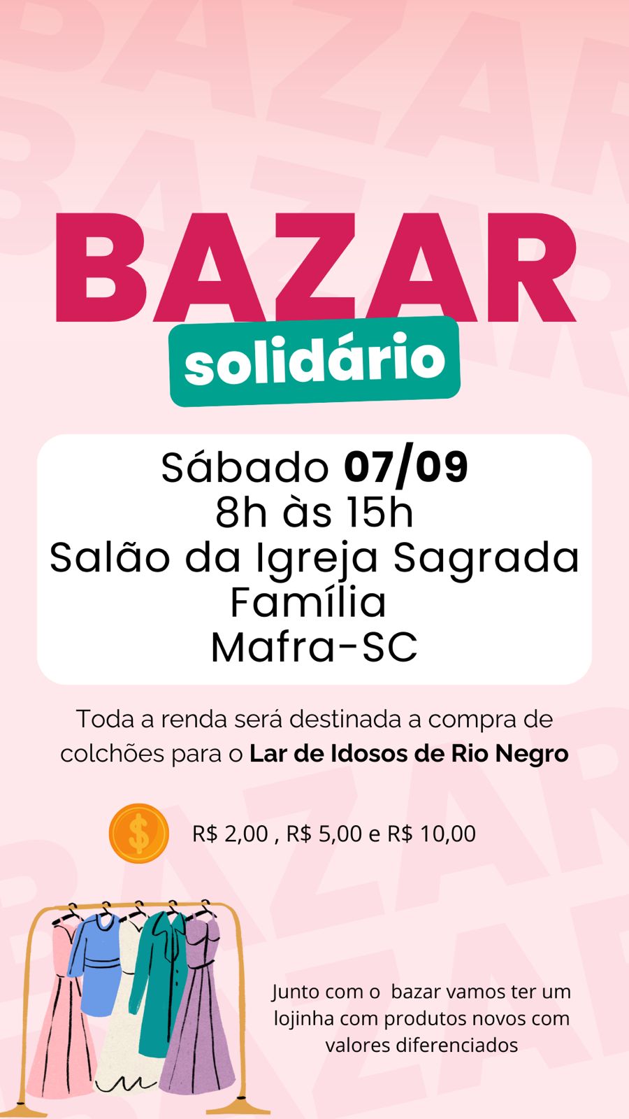 Uma bela campanha tem como objetivo trocar os colchões do lar de idosos de Rio Negro com a parceria da loja da fábrica de Jaraguá do Sul. Já foram trocados 30 e ainda faltam 20 colchões e mais 50 travesseiros. Por isso um bazar solidário será realizado no dia 07 de setembro (sábado) no salão da Igreja Sagrada Família, no Centro. Prestigie e colabore!