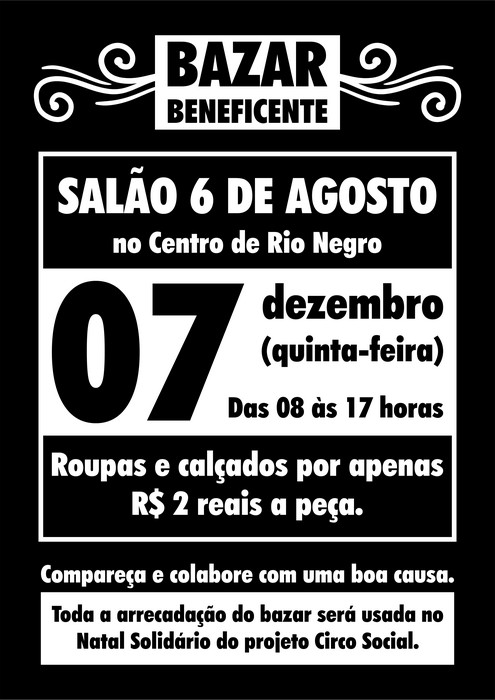 O projeto Circo Social promoverá no dia 07 de dezembro (quinta-feira), um bazar de roupas e calçados ao preço único de R$ 2,00 (dois reais) a peça. O evento será realizado no Salão 6 de Agosto, em Rio Negro, das 08h às 17h. Serão inúmeras opções de roupas e calçados a preço popular para atender a todos.
