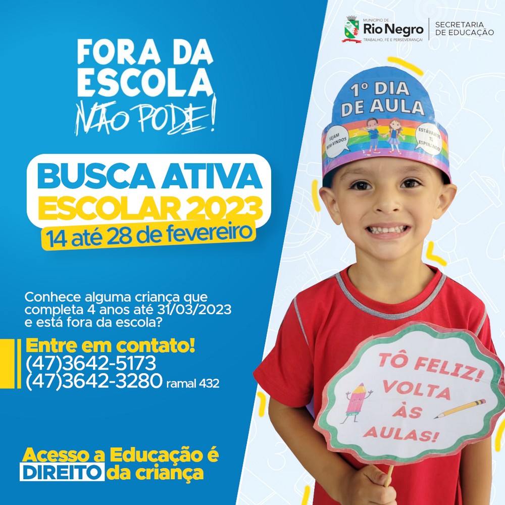 Até o dia 28 de fevereiro a Secretaria Municipal de Educação de Rio Negro colocará em prática a Busca Ativa Escolar 2023. O objetivo é garantir o direito à educação para as crianças.