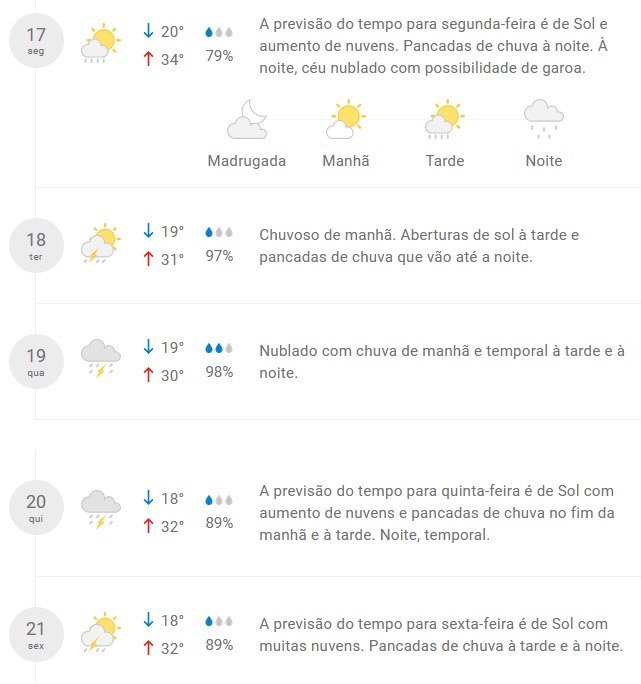 A onda de calor deve continuar nesta semana. Para esta segunda-feira a previsão do tempo indica 34 graus. De acordo com o site Clima Tempo, a previsão é de Sol e aumento de nuvens, com pancadas de chuva à noite.