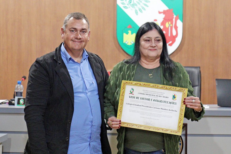 Durante a 19ª Sessão Ordinária, realizada na noite de terça-feira (17), a Câmara Municipal de Rio Negro prestou uma homenagem especial ao Colégio Estadual Presidente Caetano Munhoz da Rocha, que completa 76 anos de fundação em 2025. A instituição foi agraciada com um Voto de Louvor e Congratulações, proposto pelo presidente da Casa, vereador Odair Pereira, e aprovado por unanimidade pelos parlamentares.