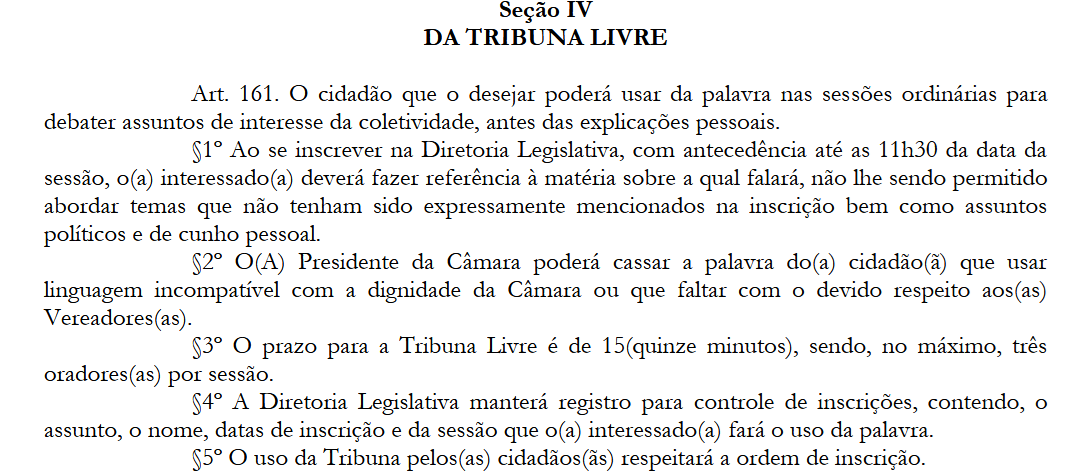 Antes do início da fala do prefeito o cronômetro da Câmera foi acionado nas telas do plenário. O tempo estipulado foi de cinco minutos, mas de acordo com o Regimento Interno atual da Câmara, disponível neste link, o prazo para a tribuna livre é de 15 minutos.