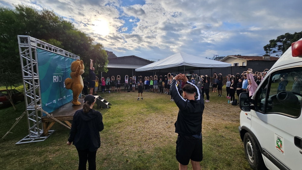 O prefeito Alessandro Cristian von Linsingen, que tem ampla experiência como professor de Educação Física, foi o responsável pelo alongamento ao lado do Serafinho, personagem marcante de Rio Negro que animou a todos.