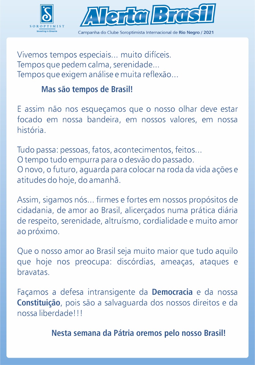 O Clube Soroptimista Internacional de Rio Negro realiza todo o ano um trabalho voltado para a conscientização e cidadania durante a Semana da Pátria, chamado Alerta Brasil. Confira: