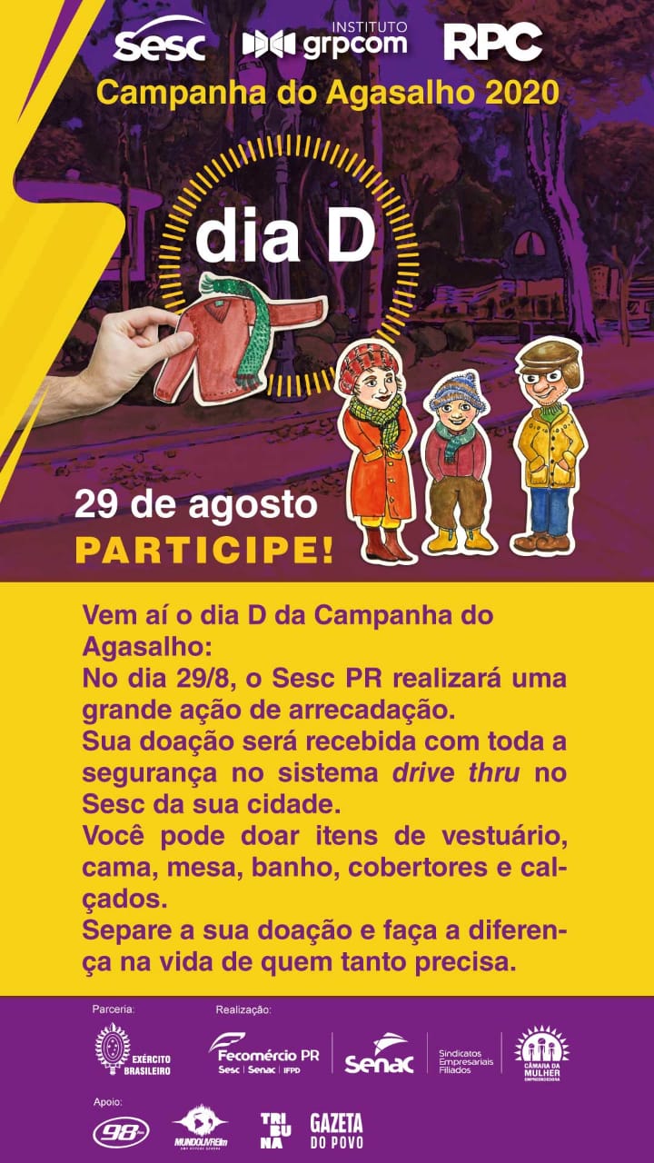 No próximo sábado (29), será realizado o “Dia D de doação e arrecadação de Agasalhos” simultaneamente em todo o Paraná.