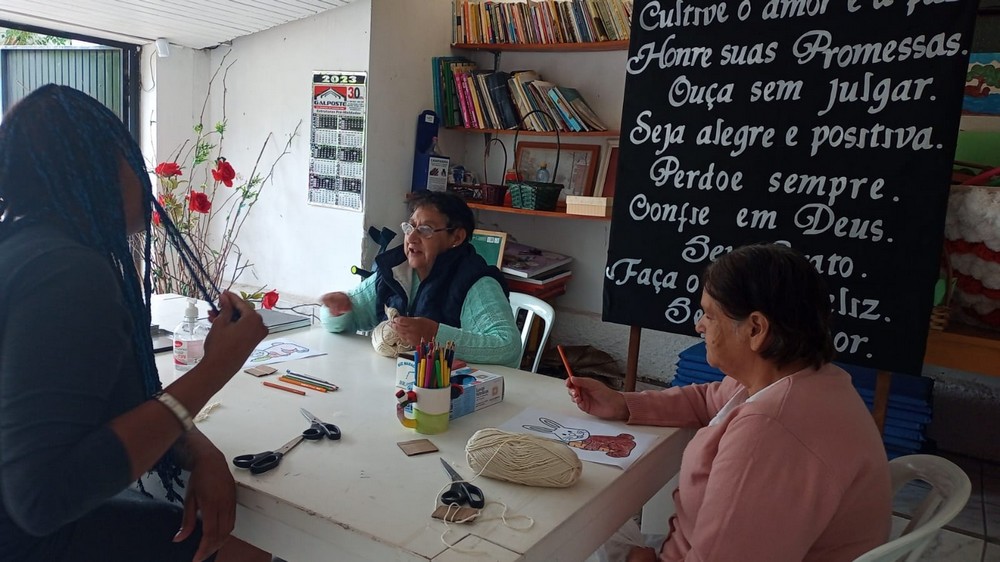 Dentro das práticas das oficinas, foi realizado um trabalho artesanal com miçangas. A ideia do trabalho é gerar um ganho motor, cognitivo e emocional. Com a atividade são estimuladas a criatividade, consciência do próprio corpo, atenção e concentração.