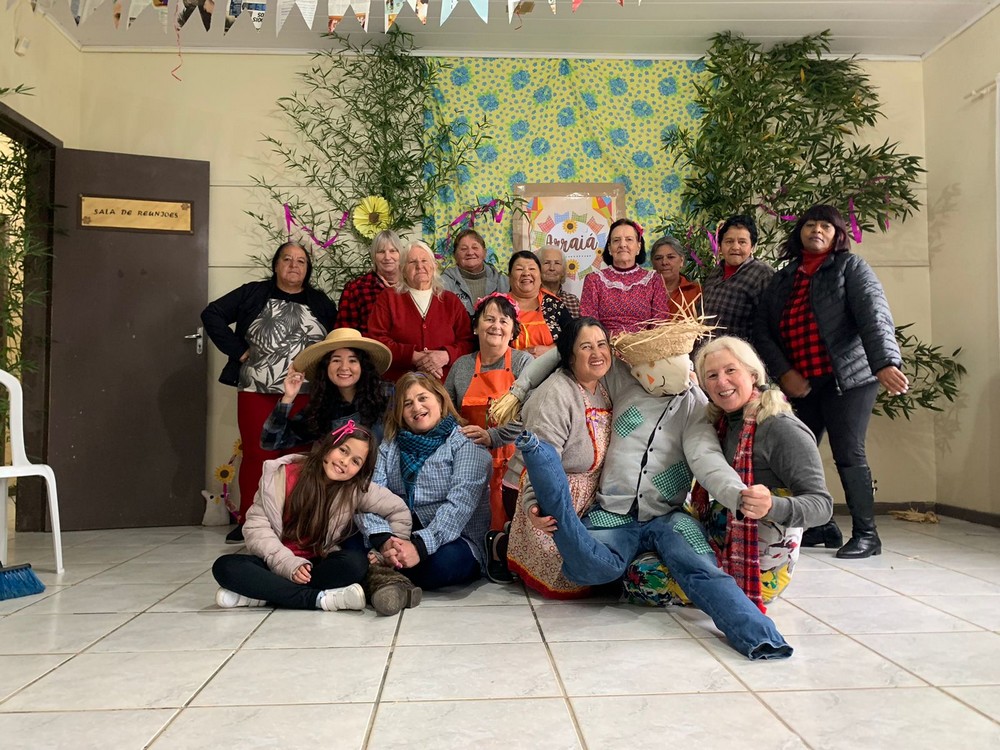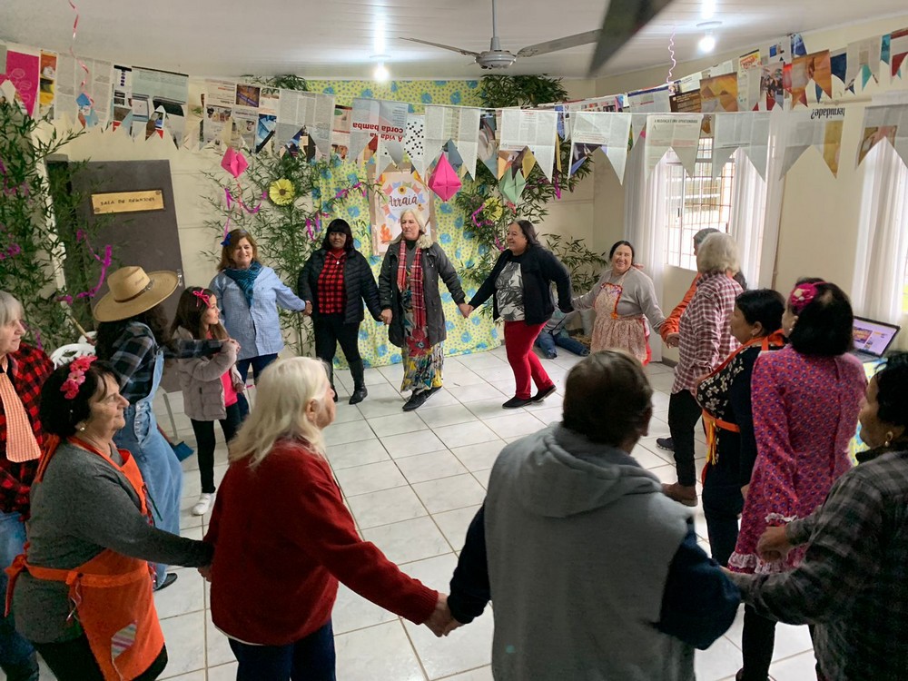 A atividade contou com quadrilha, baile e brincadeiras, além de um delicioso lanche recheado de comidas tÃpicas. Foi uma tarde animada e calorosa, que espantou o frio e a chuva.
