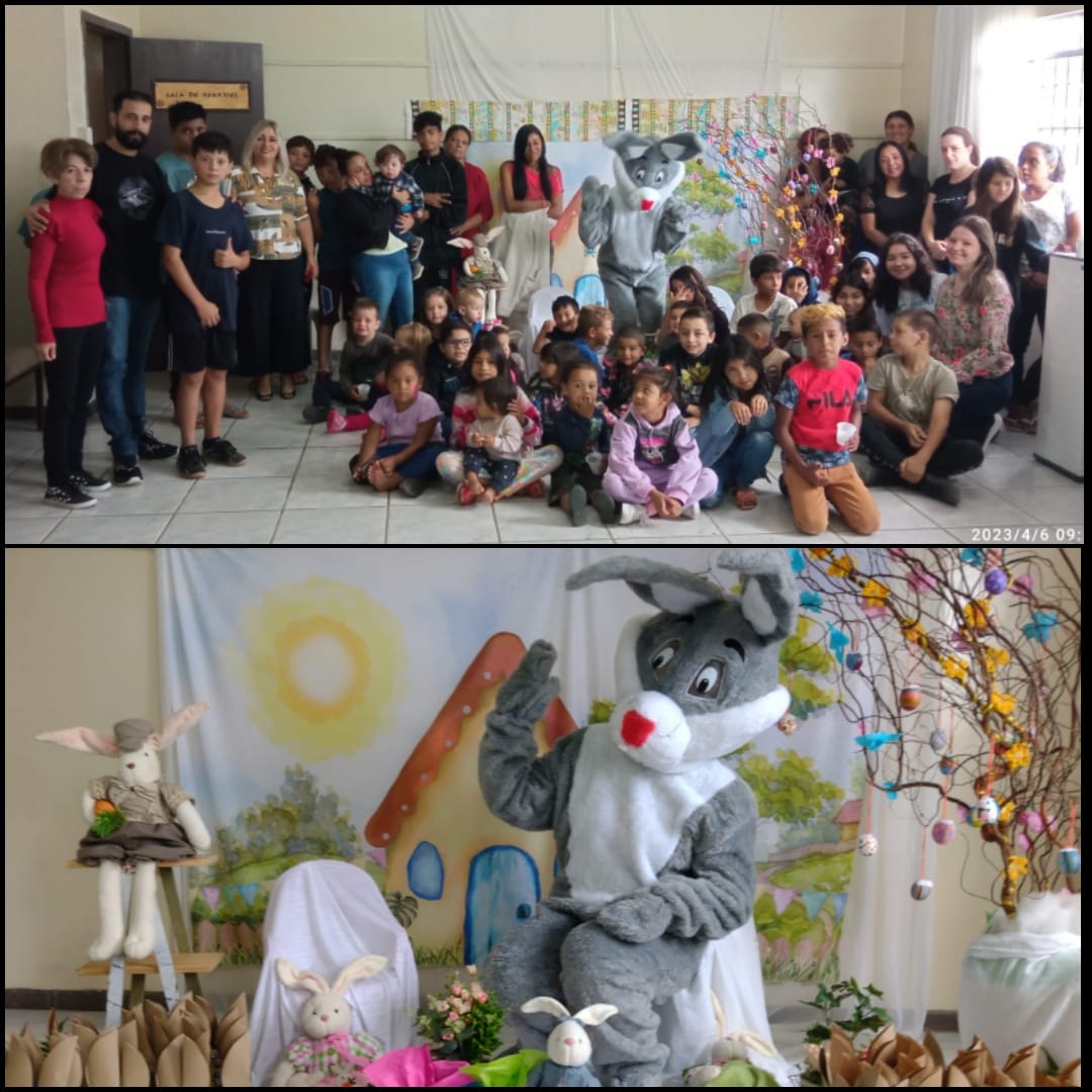 Esse símbolo é utilizado por representar a fertilidade, o nascimento e a esperança da vida. Apreciado por gerações e gerações, o coelhinho traz consigo momentos de muita diversão e alegria para todos, em especial para a criançada, motivo pelo qual o Centro de Convivência Henrique Witt, localizado no bairro Alto realizou um momento de integração entre as crianças e o Coelhinho da Pascoa, com a entrega de docinhos, pipoca, suco, atividade de pintura, muito abraço carinhoso e fotos com o tradicional Coelhinho.