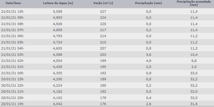 Pelo monitoramento da defesa civil de Santa Catarina, em Rio Negrinho/ Ponte do Lajeado, o rio Negrinho já está com alerta para enchente (situação às 21 horas de 20/1/2021)