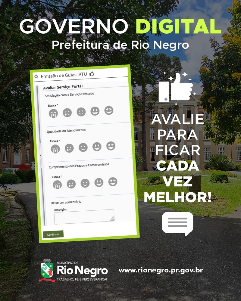 A pesquisa é importante para tornar o Governo Digital do município de Rio Negro cada vez mais simples e acessível à população. Com a avaliação será possível adequar os serviços digitais às necessidades do usuário.