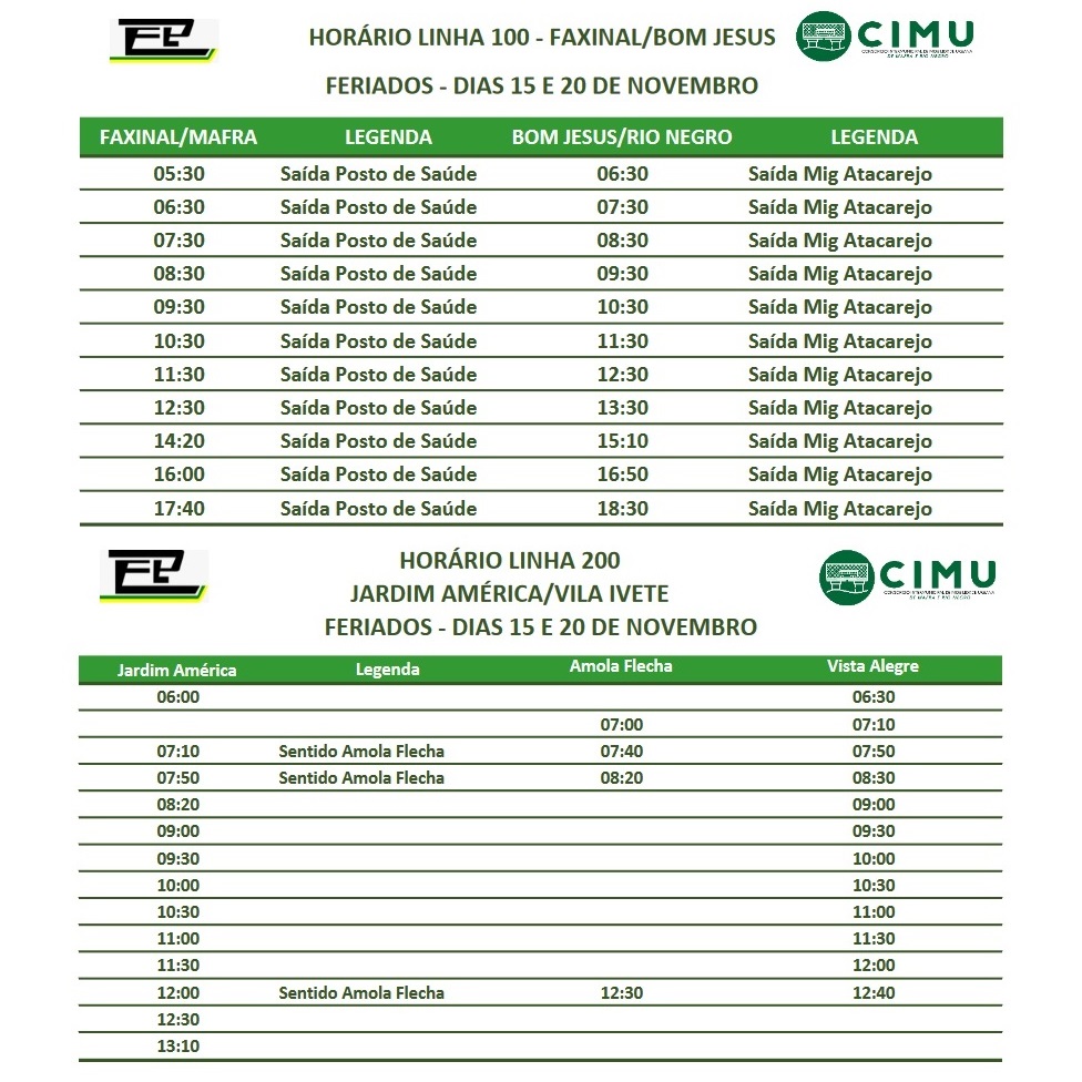 O Consórcio Intermunicipal de Mobilidade Urbana (CIMU) de Rio Negro-PR e Mafra-SC informa que durante o feriado da Proclamação da República (15 de novembro) e do Dia Nacional de Zumbi e da Consciência Negra (20 de novembro), as linhas Faxinal/Bom Jesus e Jardim América/Vila Ivete estarão em operação. Confira os horários nas imagens: