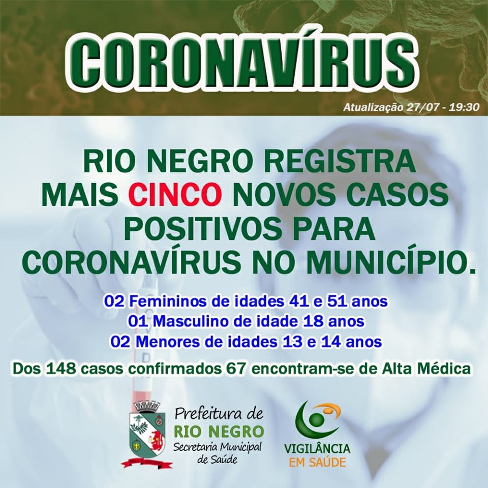 Cinco novos casos de Covid-19 são confirmados em Rio Negro nesta segunda-feira (27). Dos 148 casos confirmados, 67 pessoas estão recuperadas.
