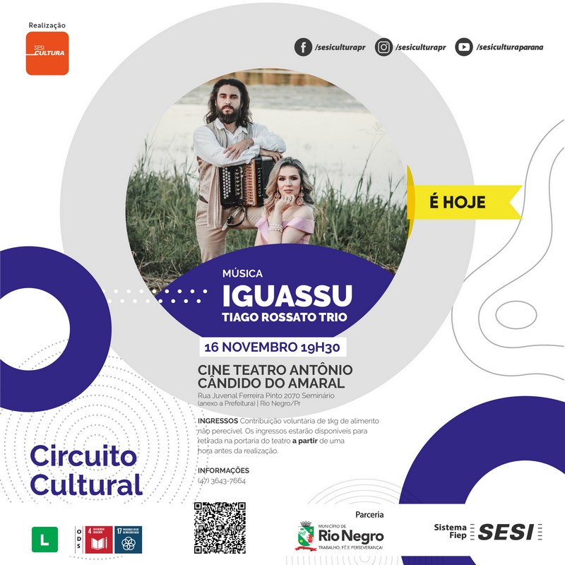 Hoje terá muita música boa em Rio Negro! O Cine Teatro Antônio Candido do Amaral (popular Cine Seminário) receberá o show Iguassu, com Tiago Rossato Trio.