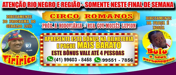 O Circo Romanos apresenta o show ao vivo com o Buiu da Praça é Nossa (SBT) e Tiririca do Programa Geraldo Luiz (Record). Sessões neste domingo às 17h30 e 20h30. Prestigie e valorize a cultura na cidade. O circo está armado na Rua Governador Moisés Lupion, no bairro Campo do Gado, em Rio Negro.