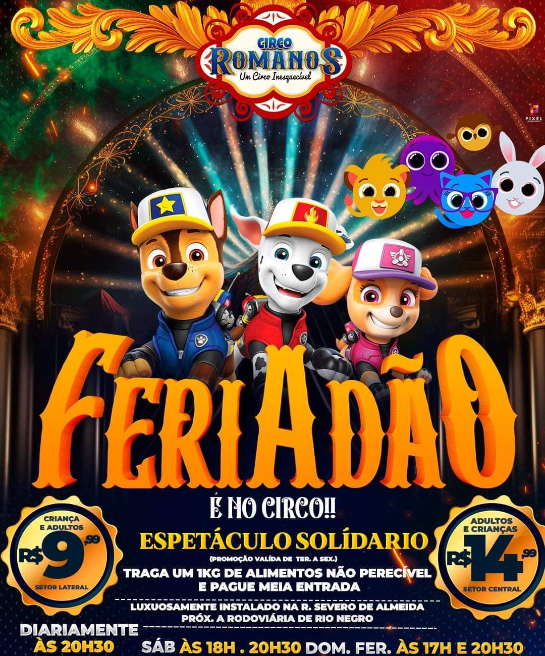 🎩🎪 O Circo Romanos está com uma bela promoção solidária. Até esta quarta-feira (dia 11) leve 1kg de alimento não perecível e pague meia-entrada. Os alimentos arrecadados serão doados para as famílias de Rio Negro atingidas pela enchente.
